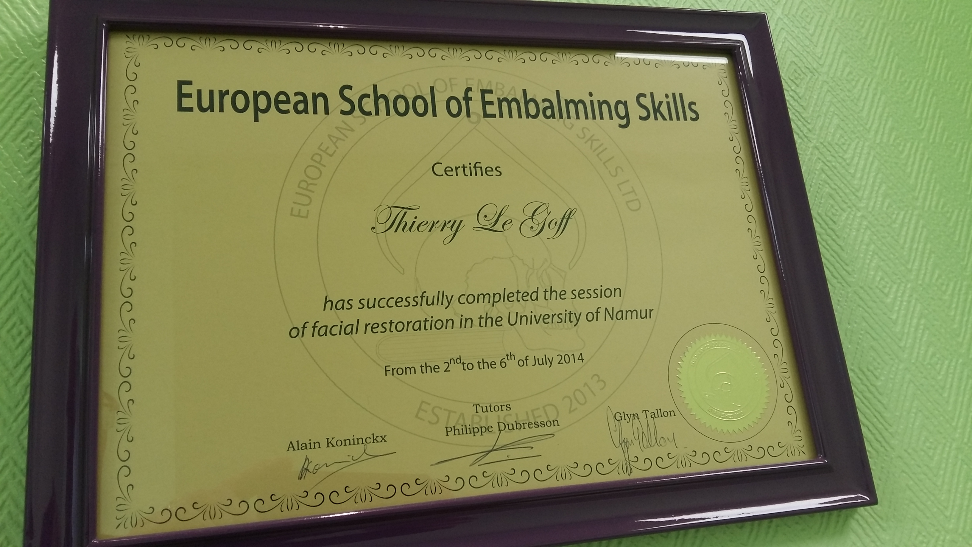 Titulaire depuis juillet 2005 du diplôme national de thanatopracteur et formé en restauration faciale en 2014 auprès de la faculté de médecine de Namur, en Belgique, par la European School of Embalming Skills, il saura répondre à vos attentes de présentation de votre défunt avec professionnalisme.