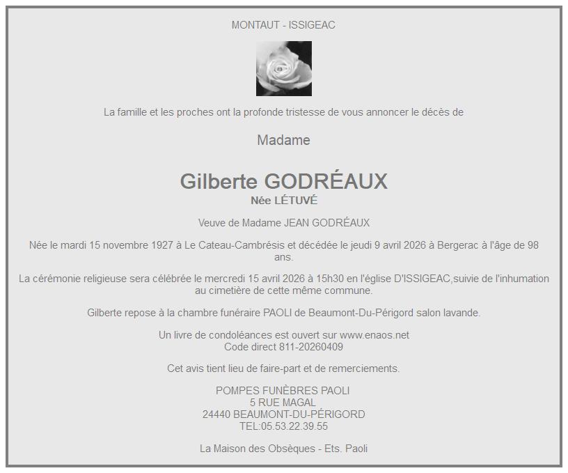 Overlijdensbericht van Madame Gilberte GODRÉAUX geboren LÉTUVÉ