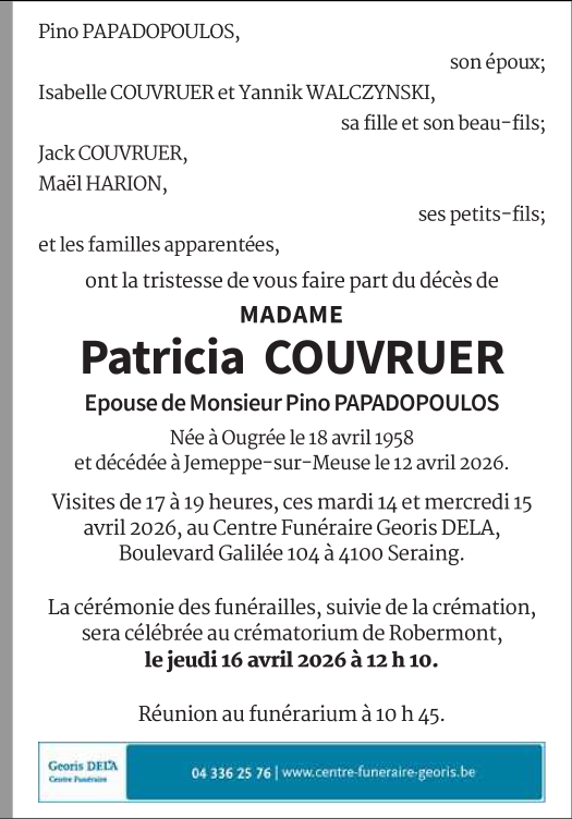 Décédée à Jemeppe-sur-Meuse (4101, Belgique) le dimanche 12 avril 2026 à l'âge de 67 ans