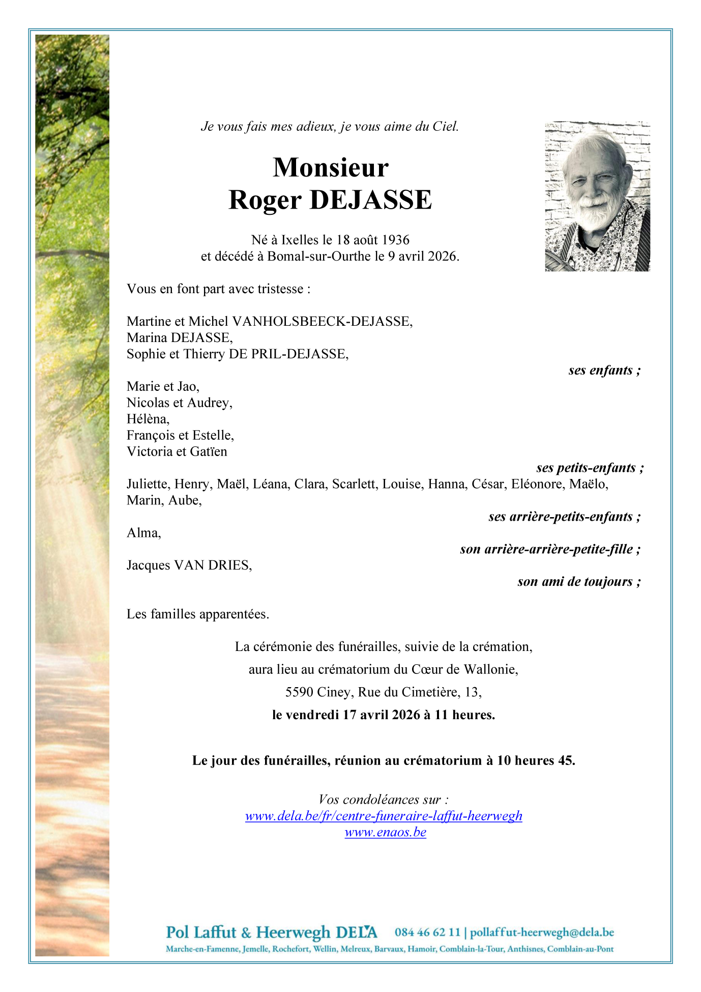 Décédé à Bomal-sur-Ourthe (6941, Belgique) le jeudi 9 avril 2026 à l'âge de 89 ans