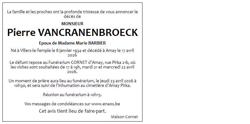 Funérarium CORNET d'Amay de aujourd'hui, jeudi 23 avril à 10 heures 30