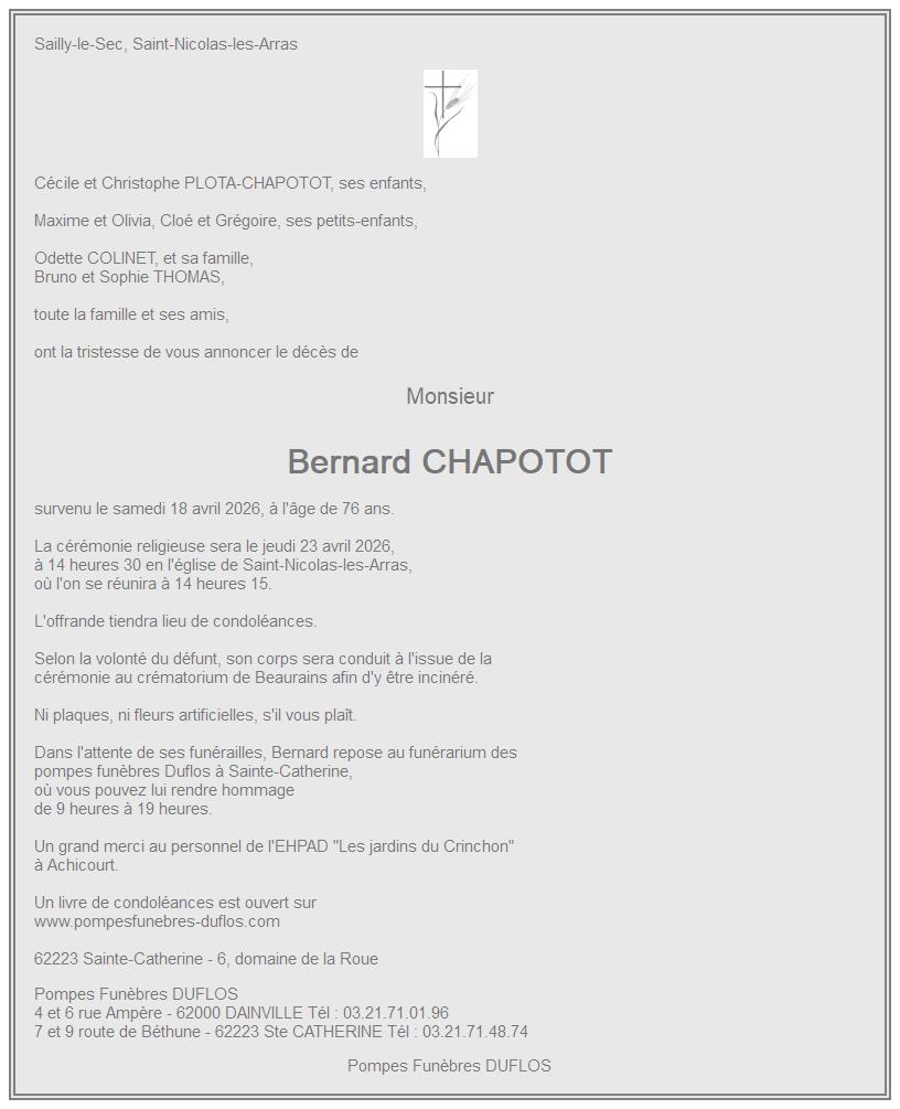 Avis de décès de Monsieur Bernard CHAPOTOT