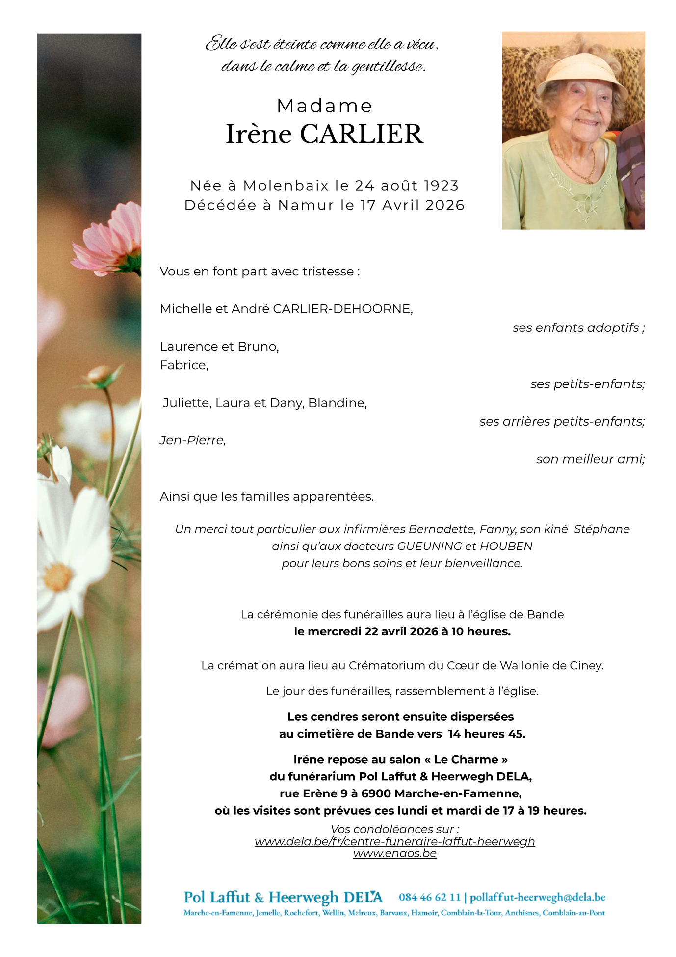 Avis de décès de Madame Irène CARLIER