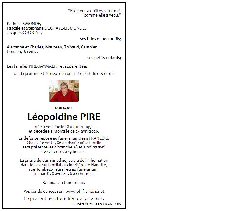 Funérarium Jean FRANCOIS de Crisnée demain, mardi 28 avril à 11 heures