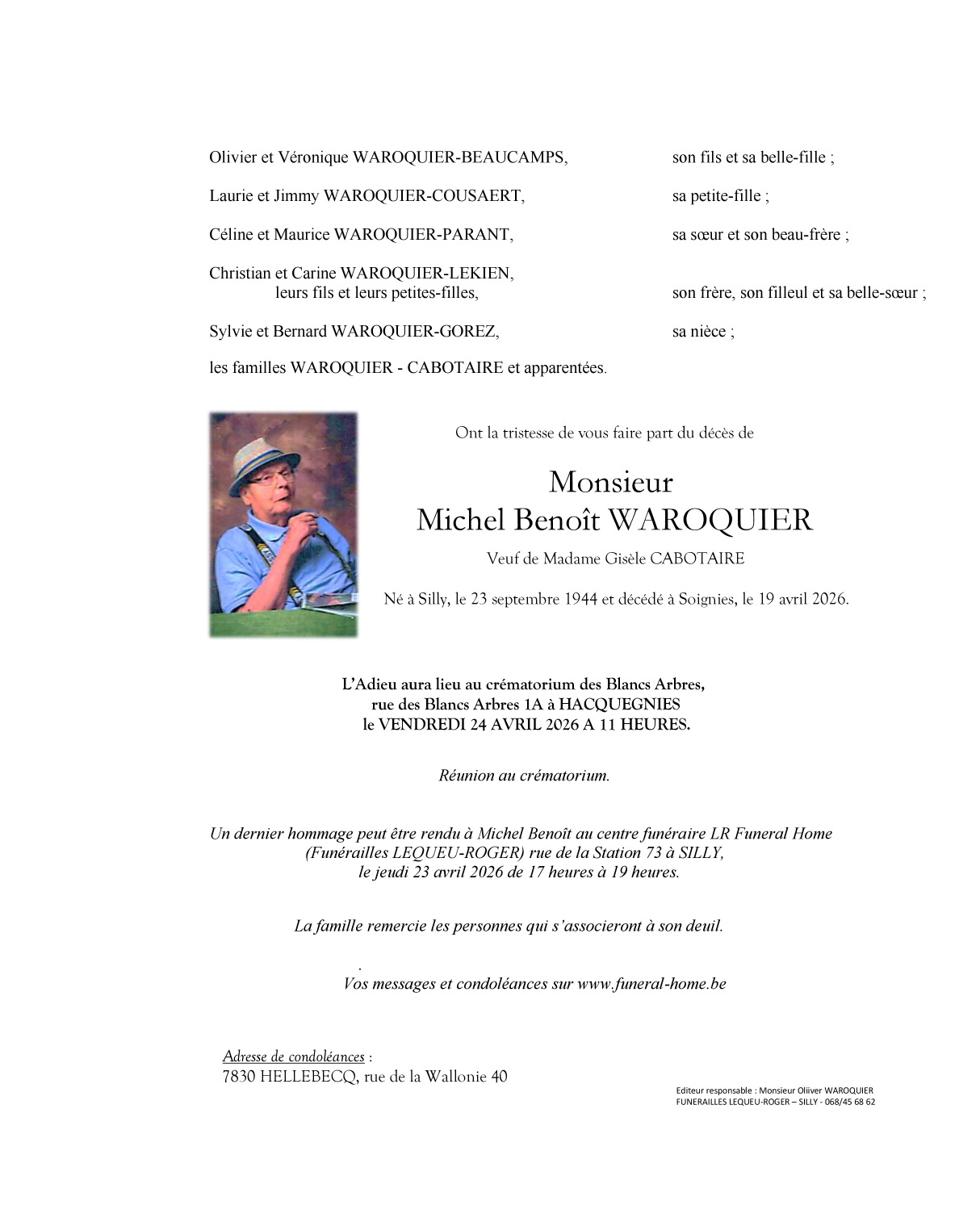 crématorium des Blancs Arbres de Frasnes-lez-Anvaing demain, vendredi 24 avril à 11 heures