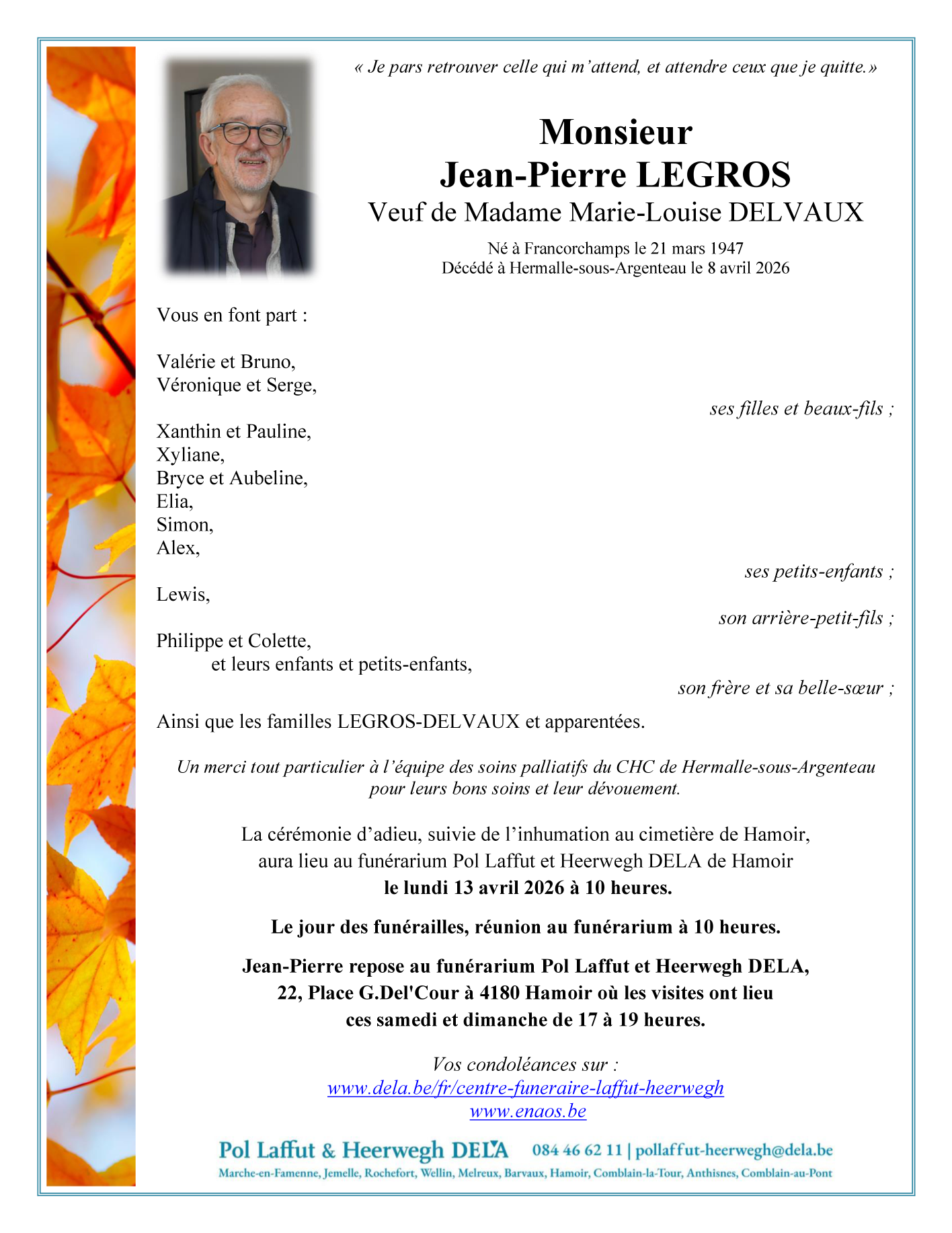 Avis de décès de Monsieur Jean-Pierre LEGROS