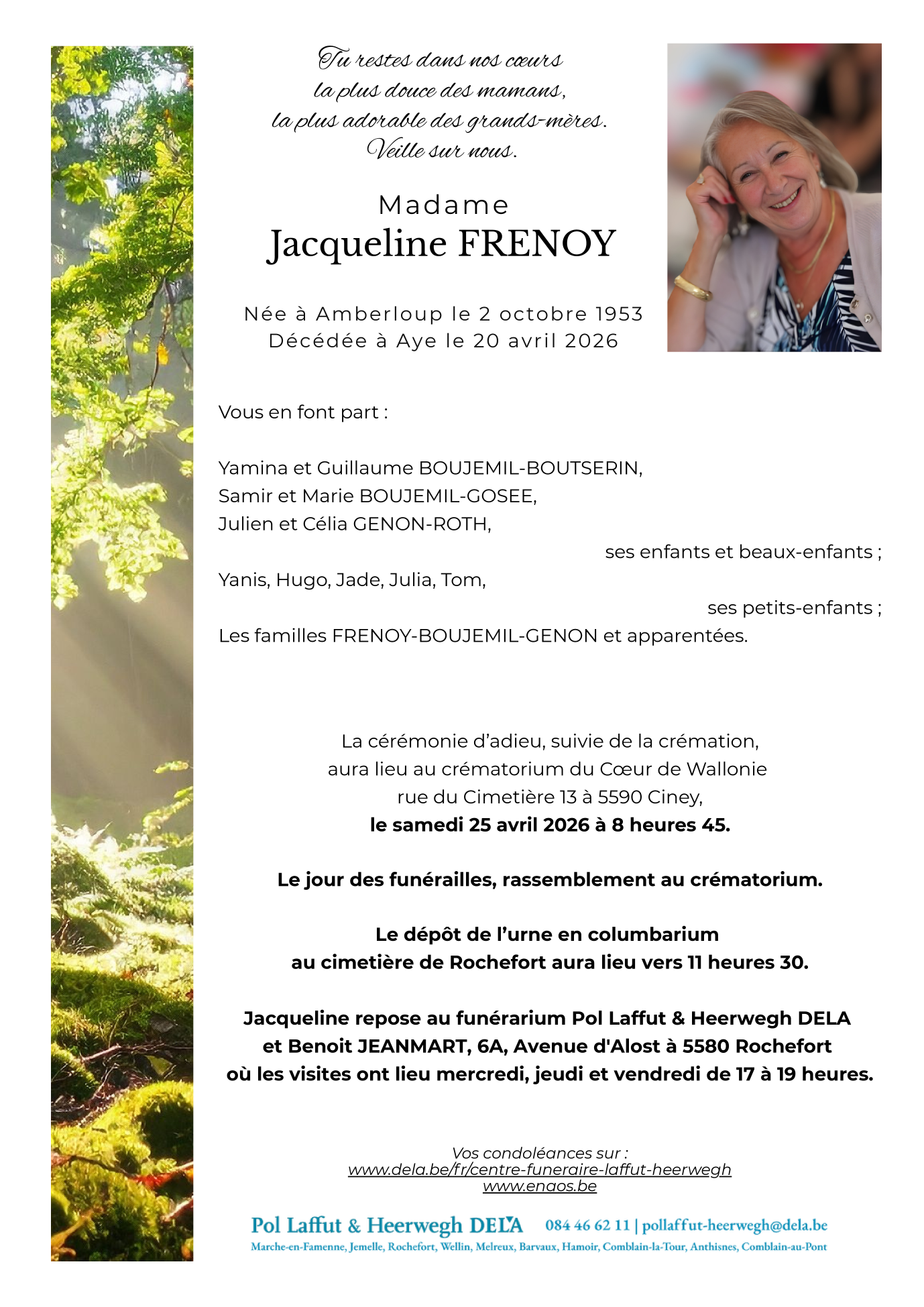 Décédée à Aye (6900, Belgique) le lundi 20 avril 2026 à l'âge de 72 ans
