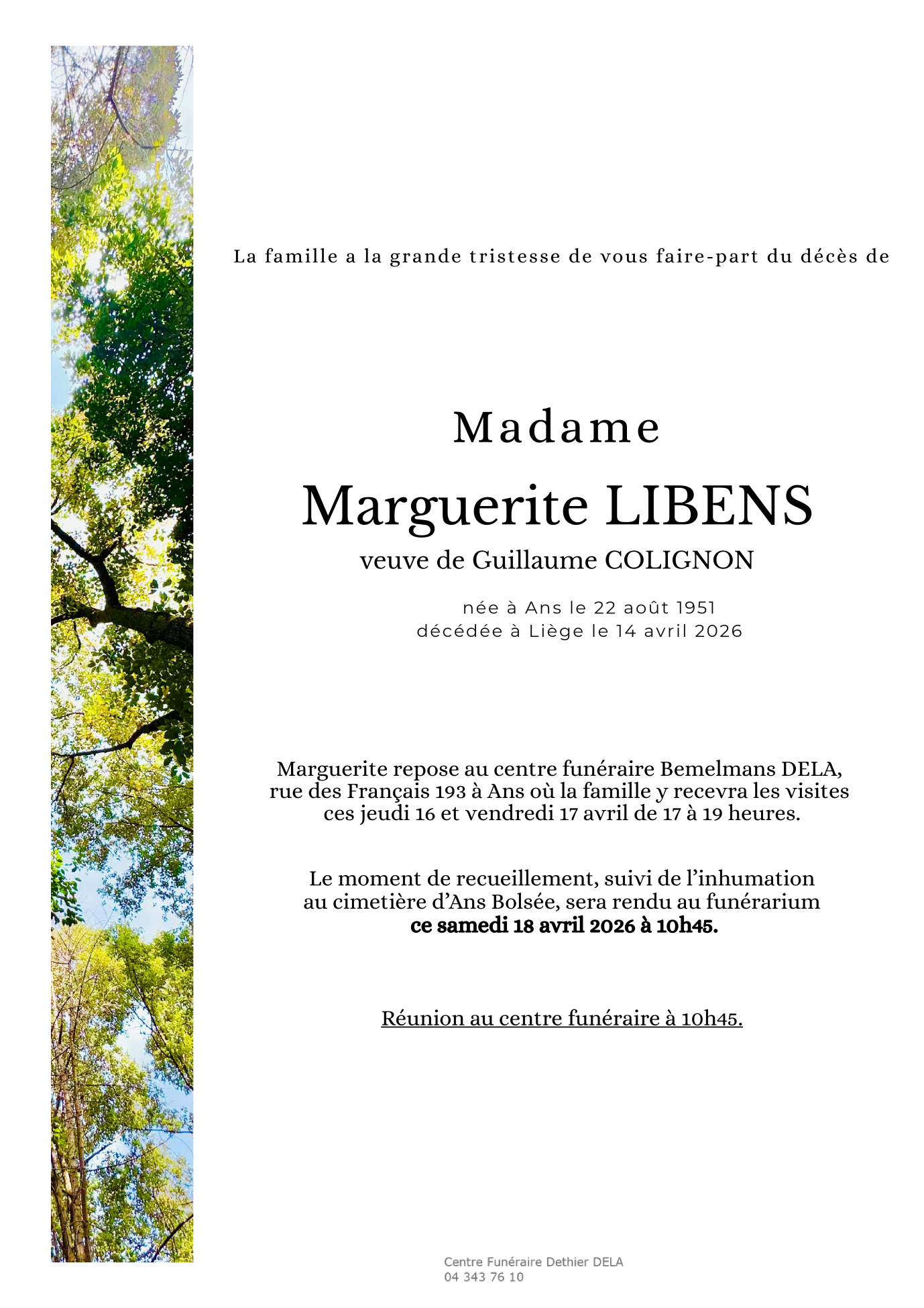 au funérarium de Ans le samedi 18 avril à 10 heures 45