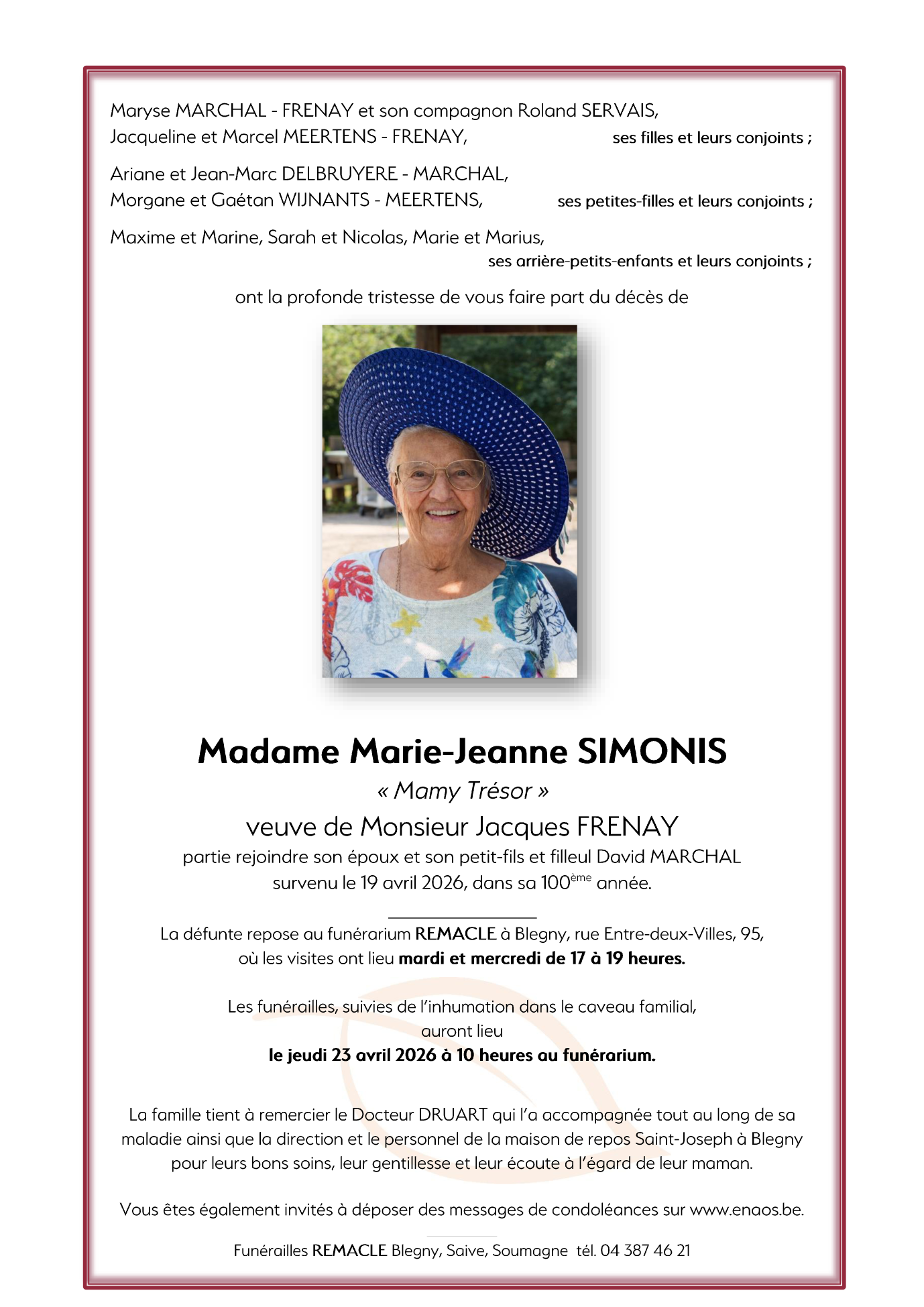Avis de décès de Madame SIMONIS Marie-Jeanne