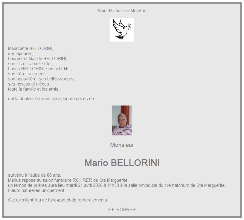 Avis de décès de Monsieur Mario BELLORINI