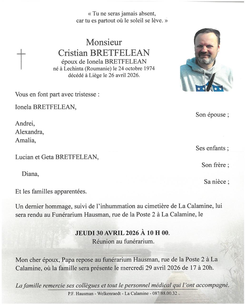 au Funérarium Hausman te La Calamine op donderdag 30 april om 10 u