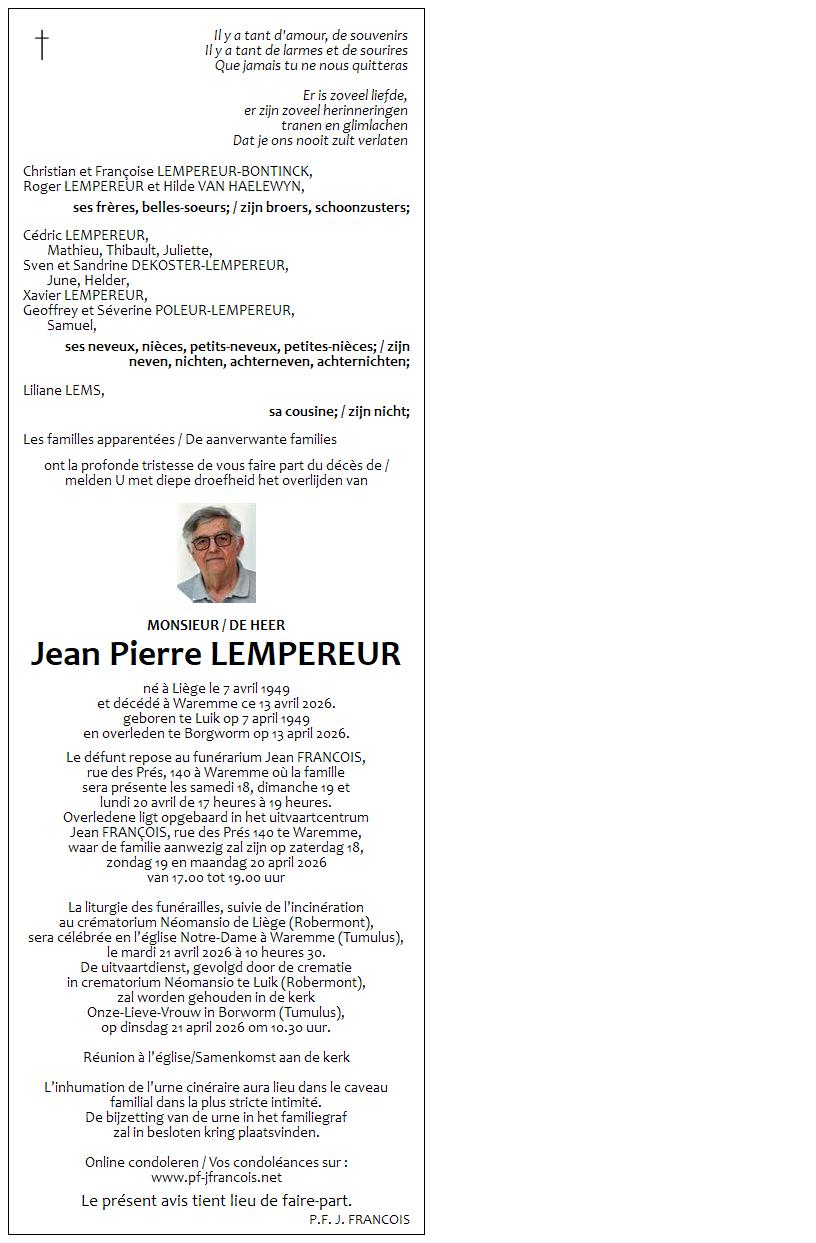 Avis de décès de Monsieur Jean Pierre LEMPEREUR