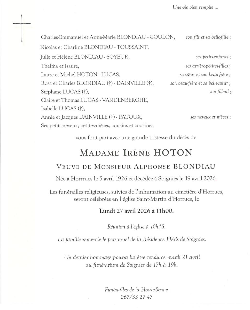 Décédée à Soignies (7060, Belgique) le dimanche 19 avril 2026 à l'âge de 100 ans