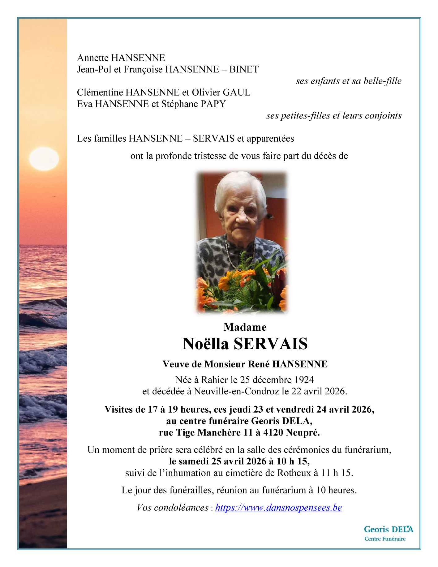 Centre Funéraire GEORIS (Neupré). de Neupré le samedi 25 avril à 10 heures 15