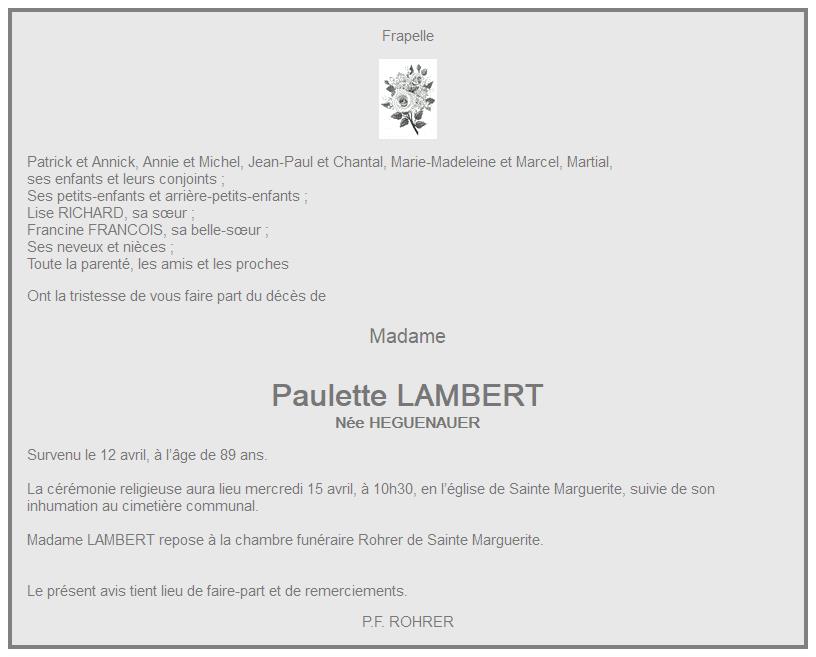 Avis de décès de Madame Paulette LAMBERT née HEGUENAUER
