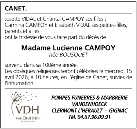 Avis de décès de Madame Lucienne CAMPOY née BOUSQUET