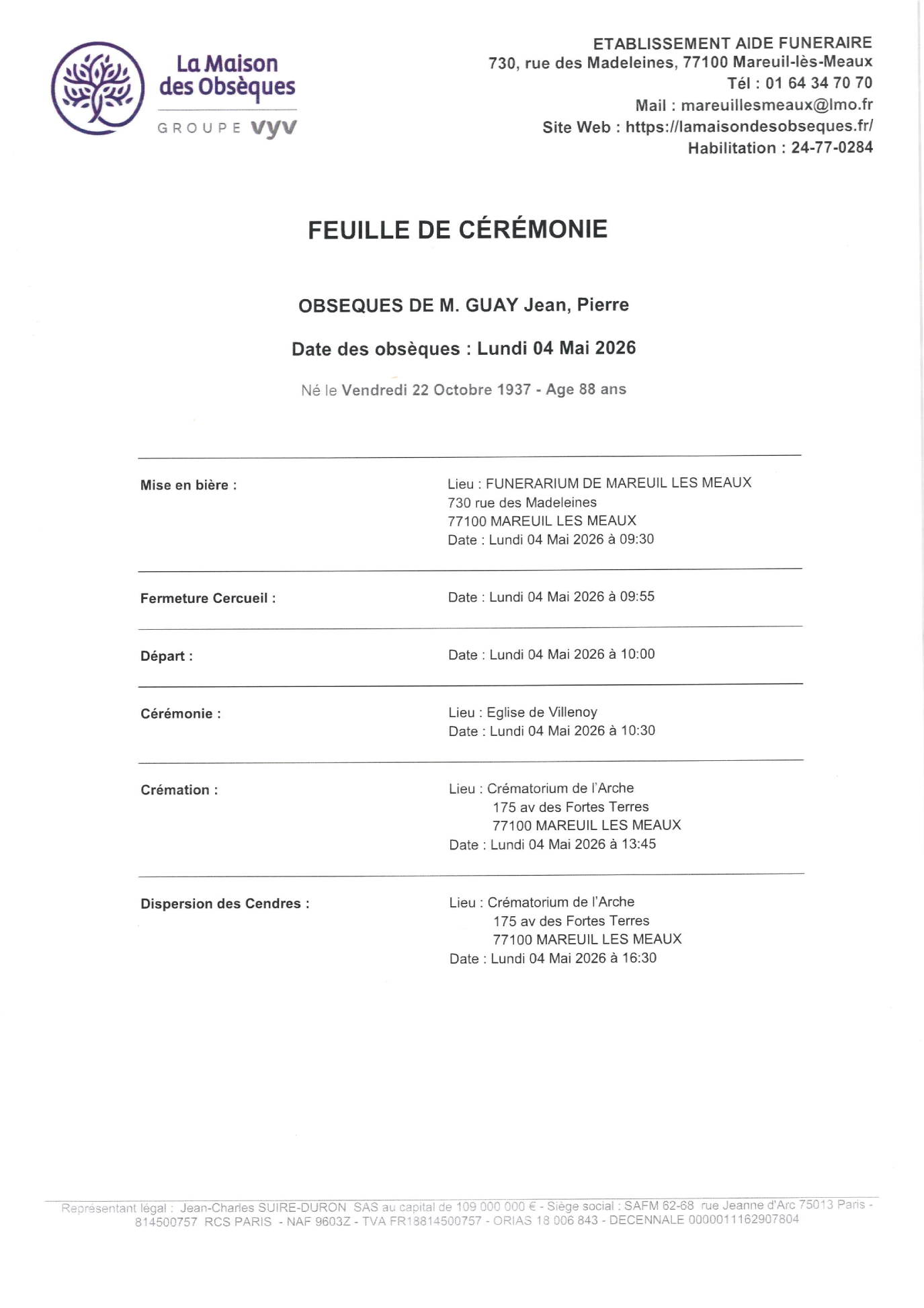 Overlijdensbericht van Monsieur Jean-Pierre GUAY