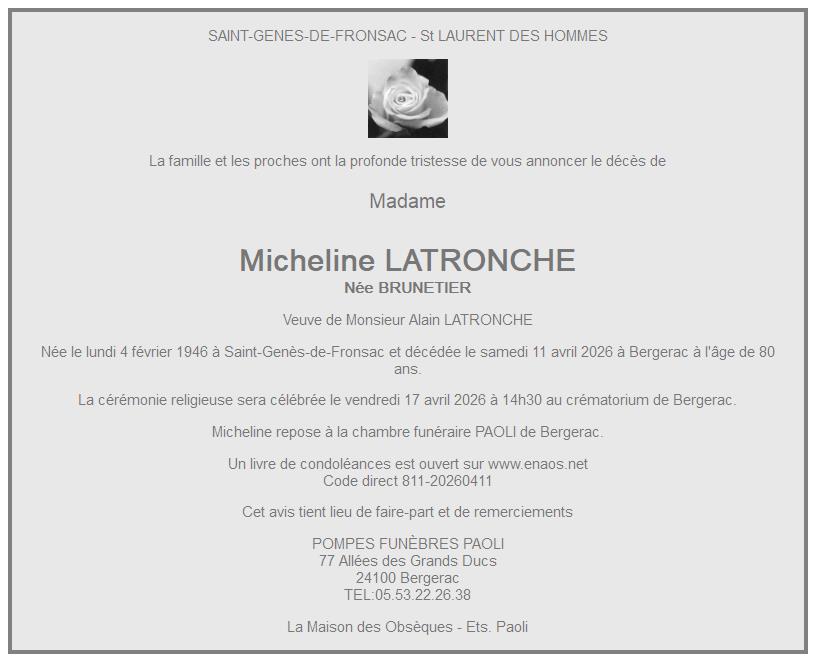 Overlijdensbericht van Madame Micheline LATRONCHE geboren BRUNETIER