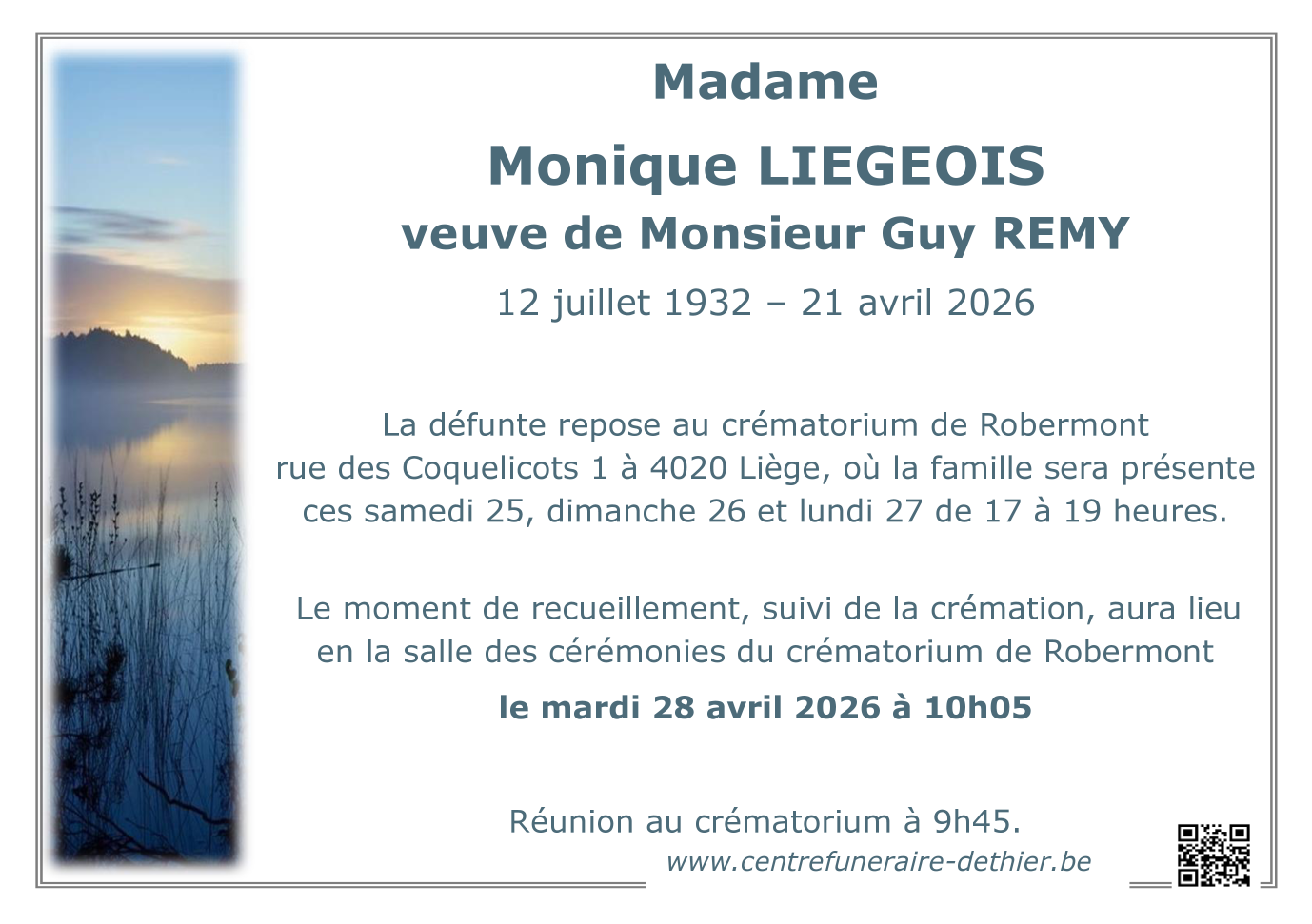 chapelle du Centre Funéraire de Liège le mardi 28 avril à 10 heures 05