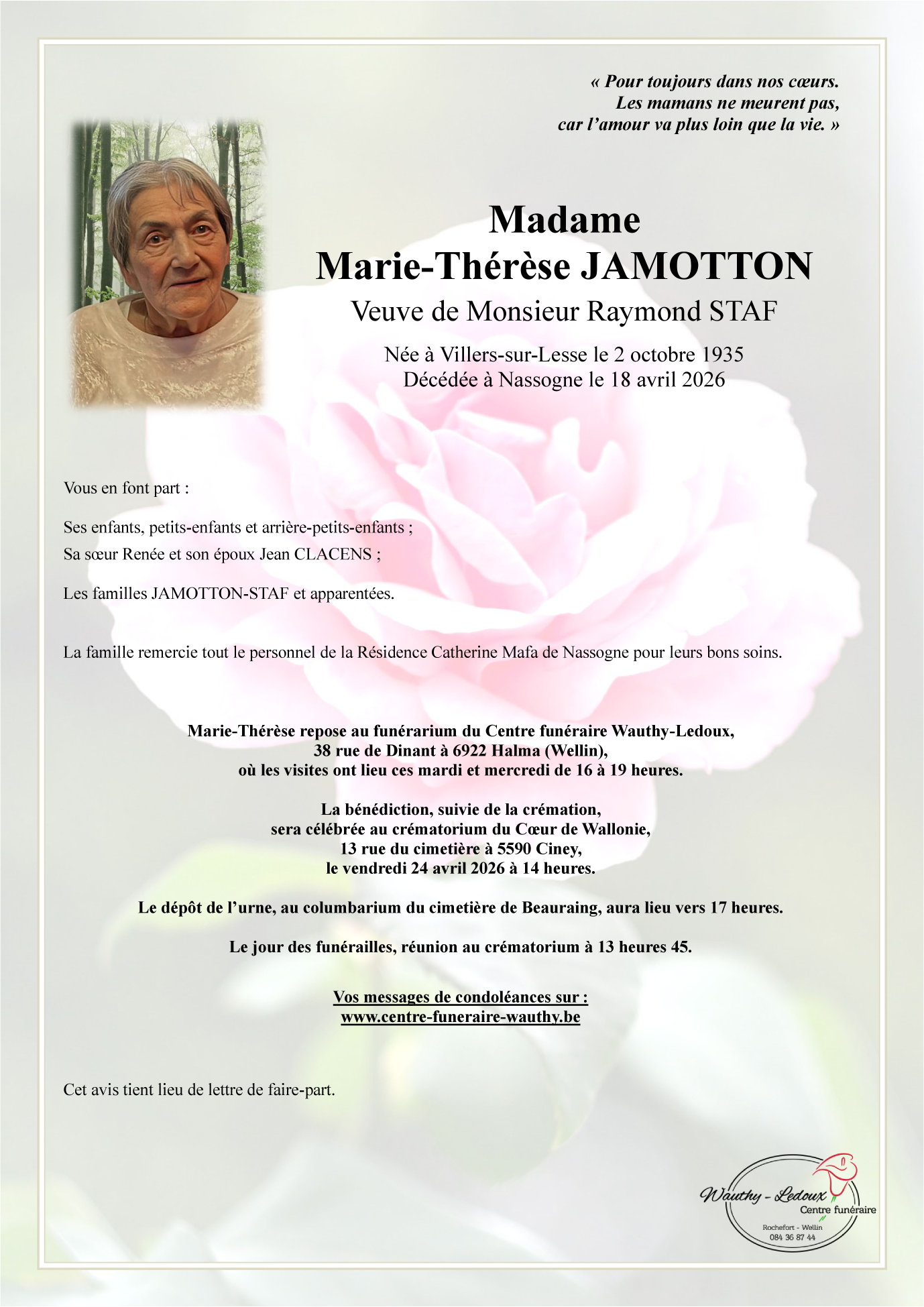 Avis de décès de Madame Marie-Thérèse JAMOTTON