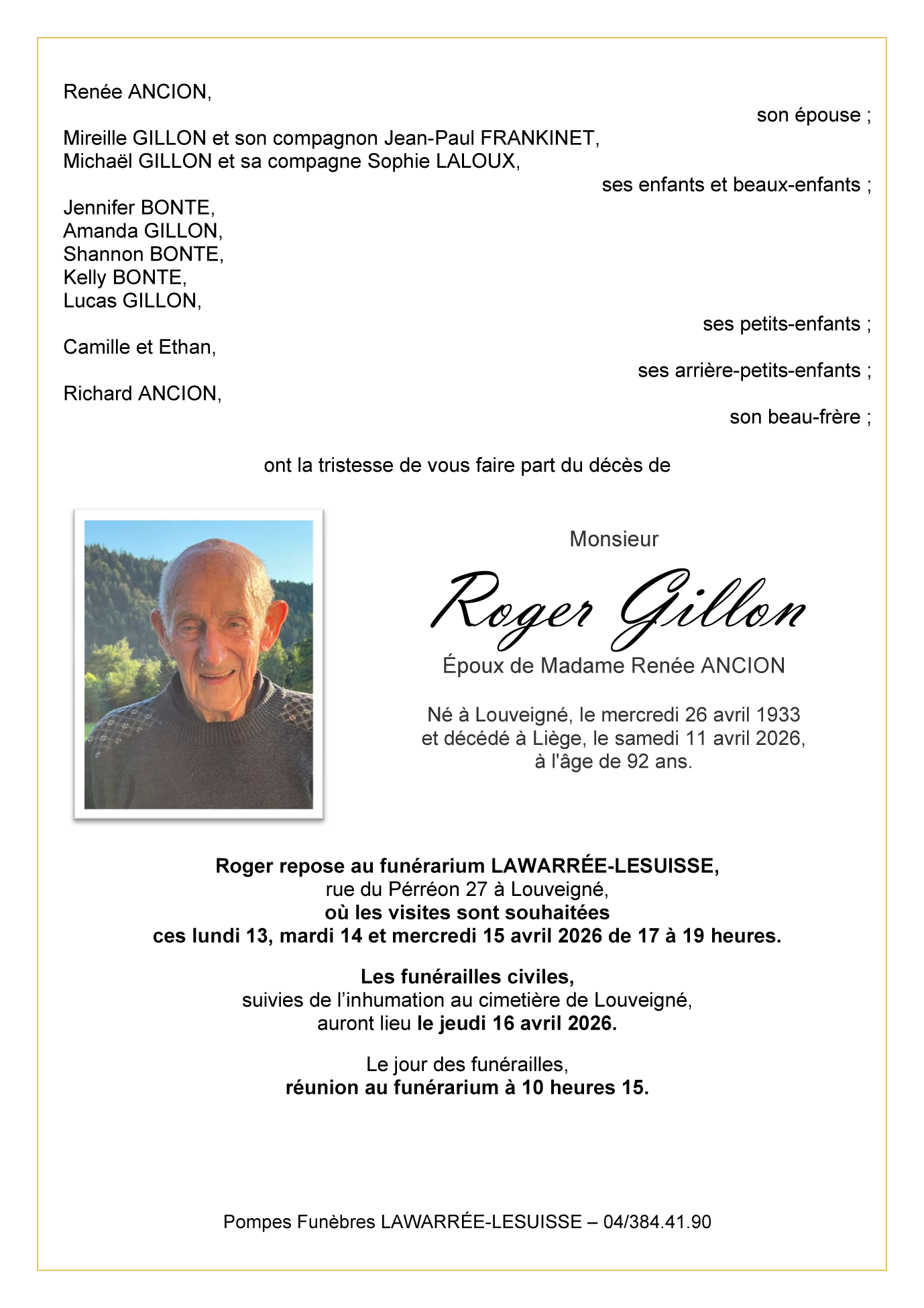 Décédé à Liège (4000, Belgique) le samedi 11 avril 2026 à l'âge de 92 ans