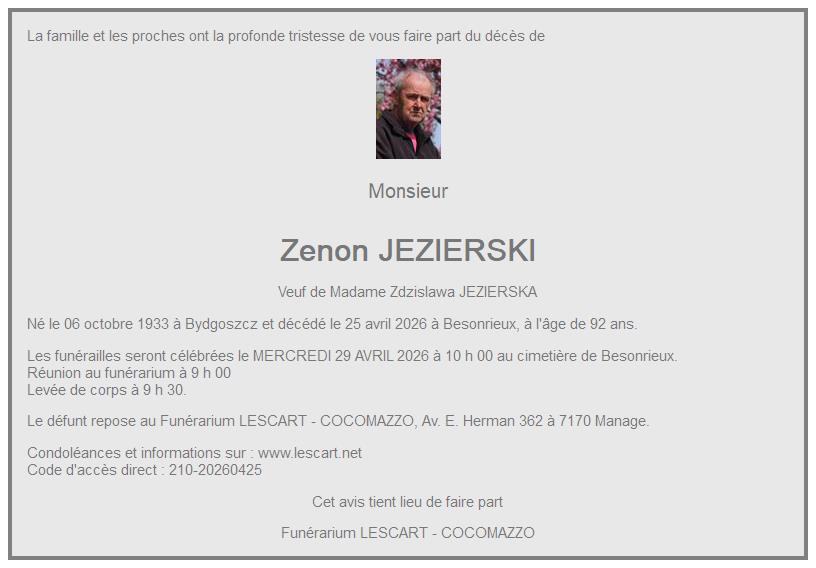 Funérarium LESCART - COCOMAZZO de Manage le mercredi 29 avril à 9 heures 30