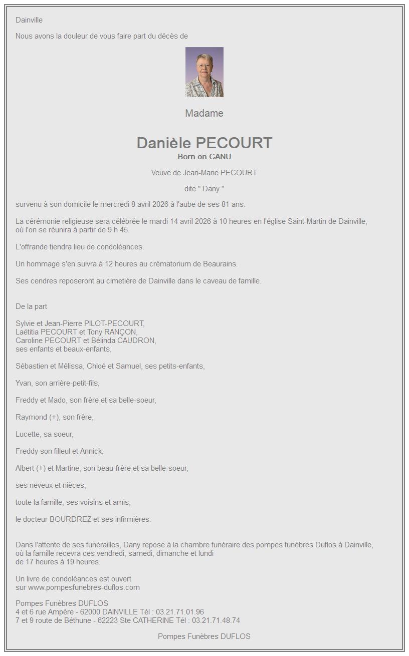 Avis de décès de Madame Danièle PECOURT née CANU