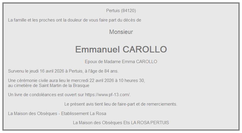 Overlijdensbericht van Monsieur Emmanuel CAROLLO