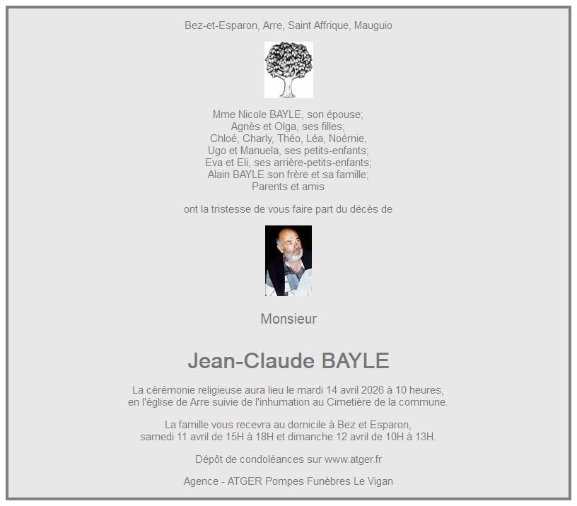 Overlijdensbericht van Monsieur Jean-Claude BAYLE