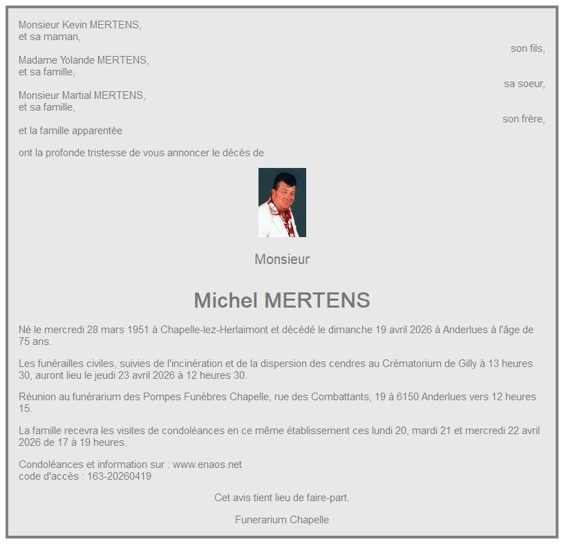 Décédé à Anderlues (6150, Belgique) le dimanche 19 avril 2026 à l'âge de 75 ans