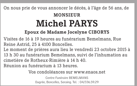 Décédé à Liège (4000, Belgique) le mercredi 21 octobre 2015 à l'âge de 56 ans