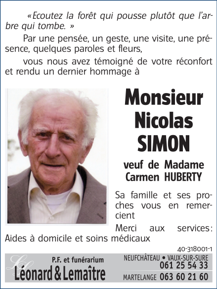 Décédé à Nassogne (6950, Belgique) le mercredi 15 mai 2019 à l'âge de 90 ans