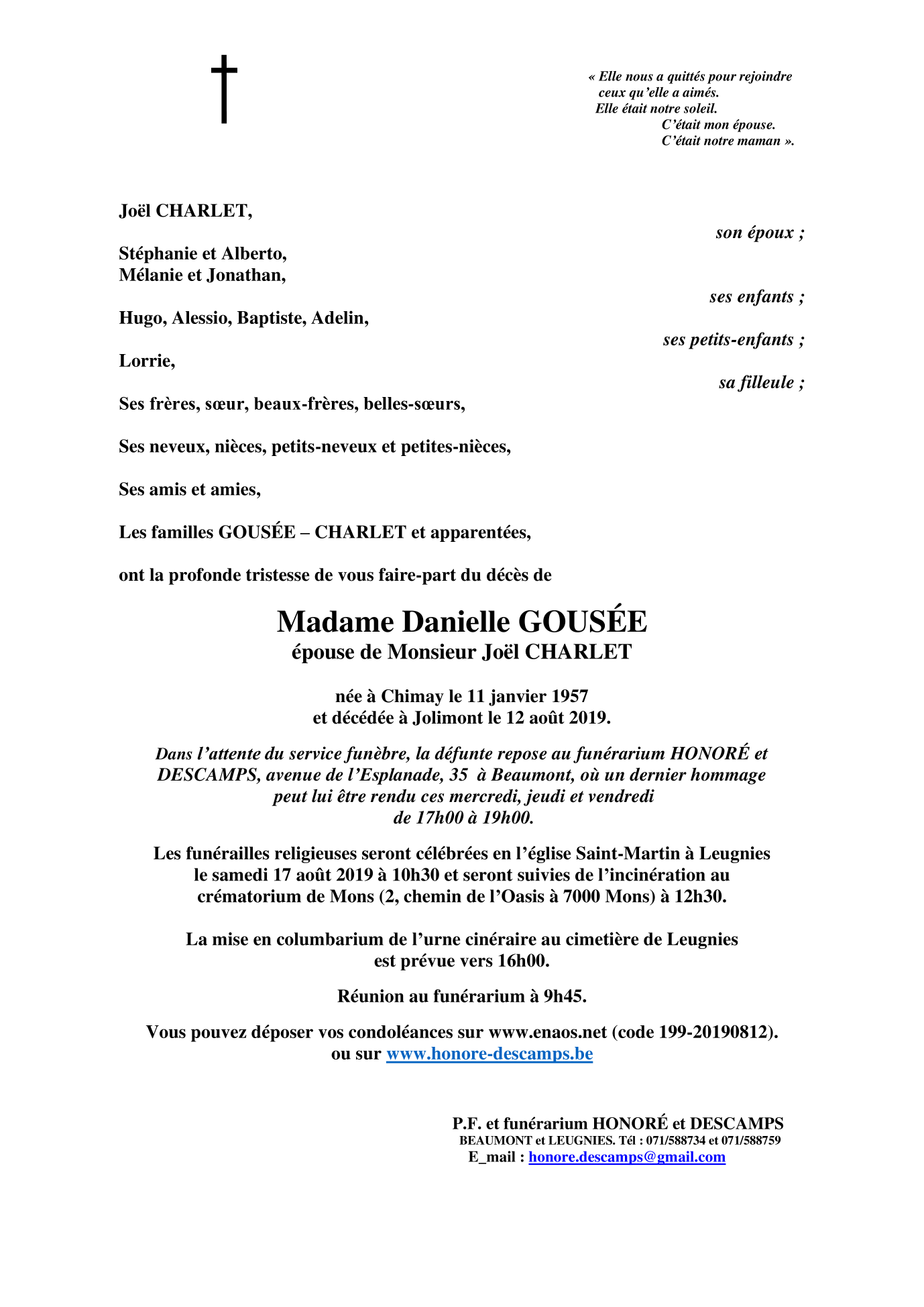 Décédée à Jolimont (7100, Belgique) le lundi 12 août 2019 à l'âge de 62 ans