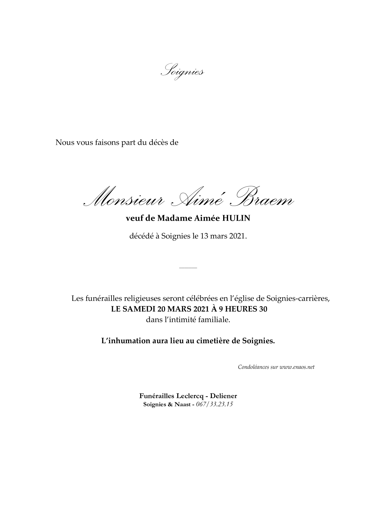 Décédé à Soignies (7060, Belgique) le samedi 13 mars 2021 à l'âge de 84 ans