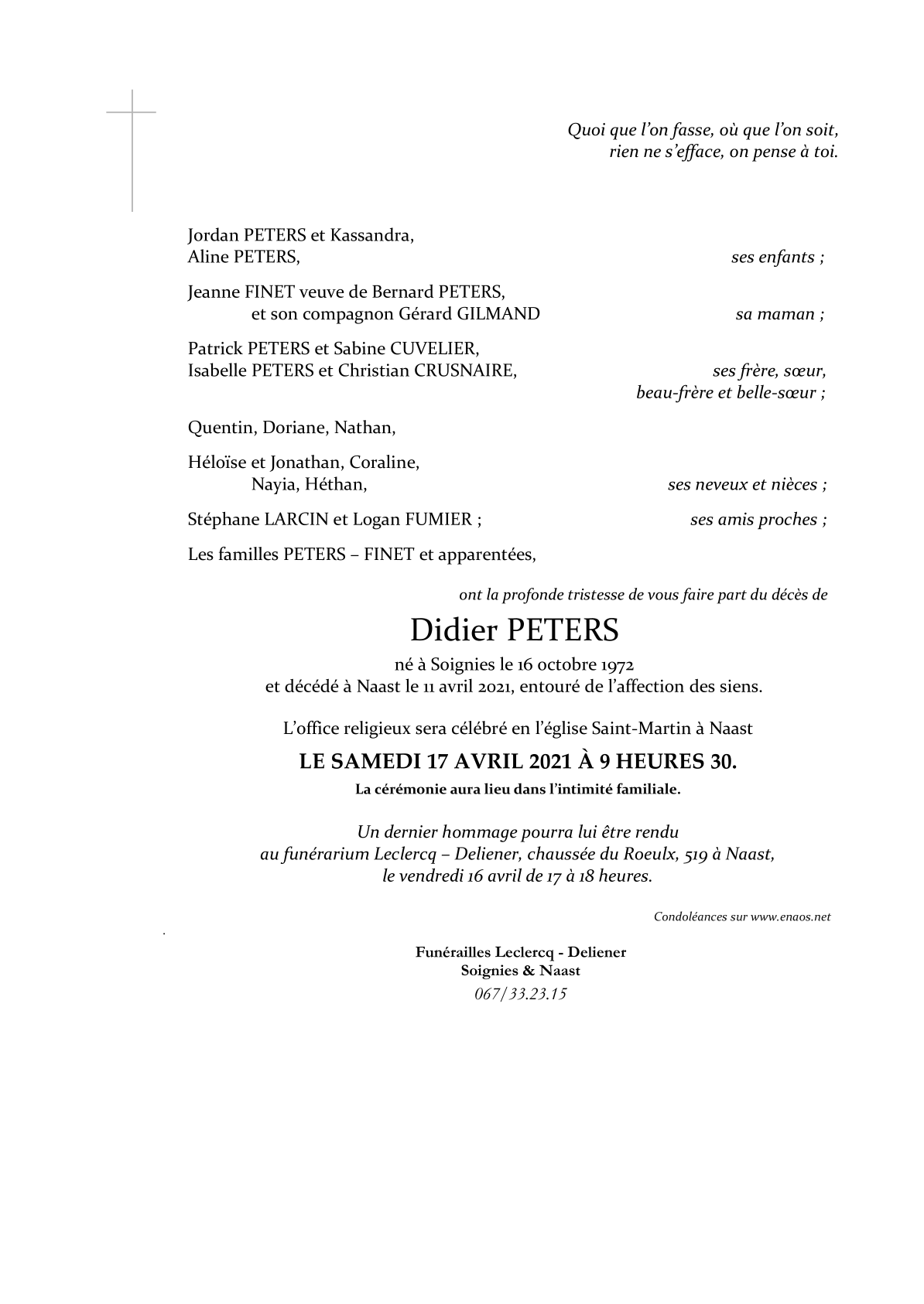 Décédé à Naast (7062, Belgique) le dimanche 11 avril 2021 à l'âge de 48 ans