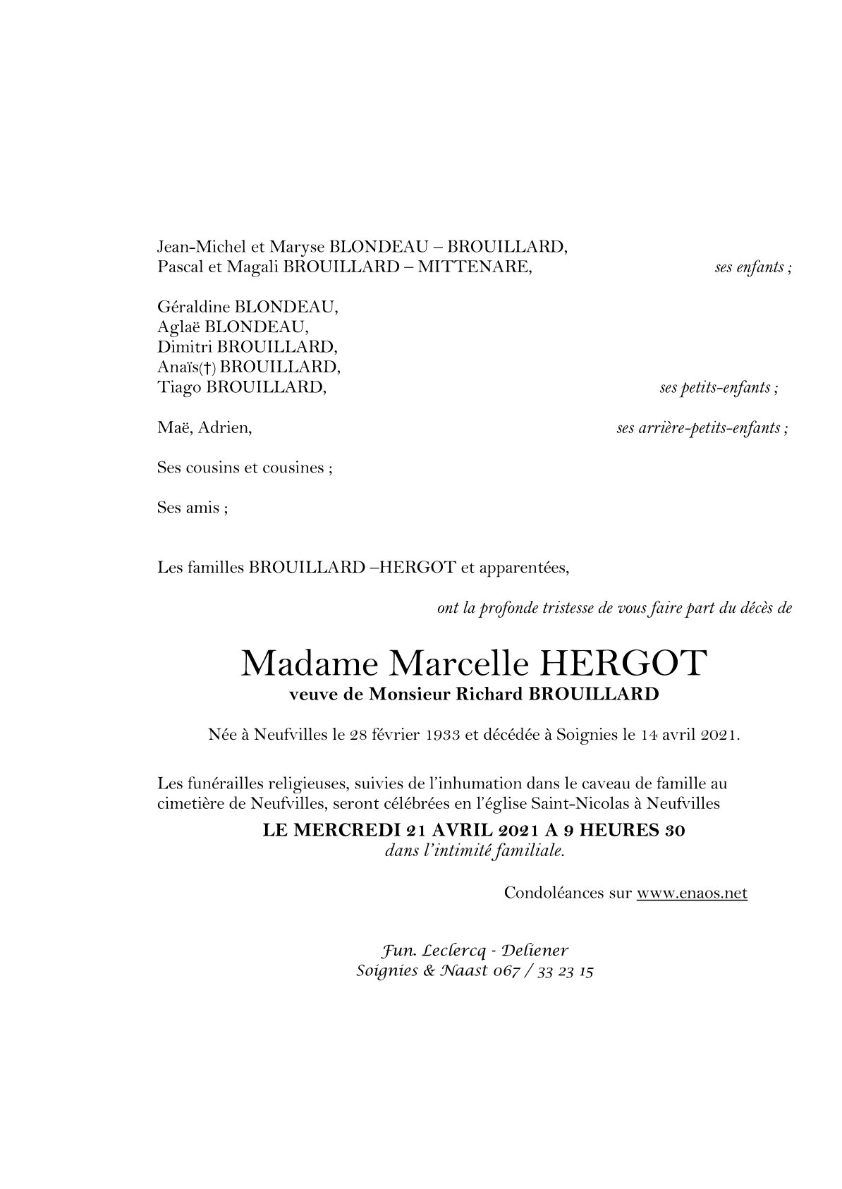 Décédée à Soignies (7060, Belgique) le mercredi 14 avril 2021 à l'âge de 88 ans