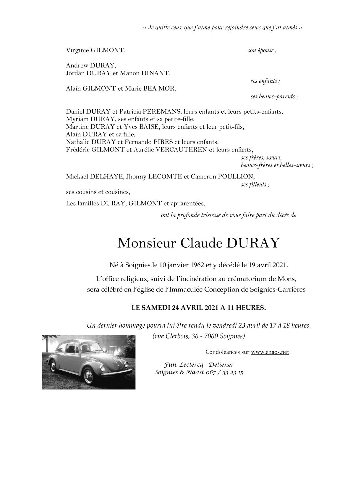 Décédé à Soignies (7060, Belgique) le lundi 19 avril 2021 à l'âge de 59 ans