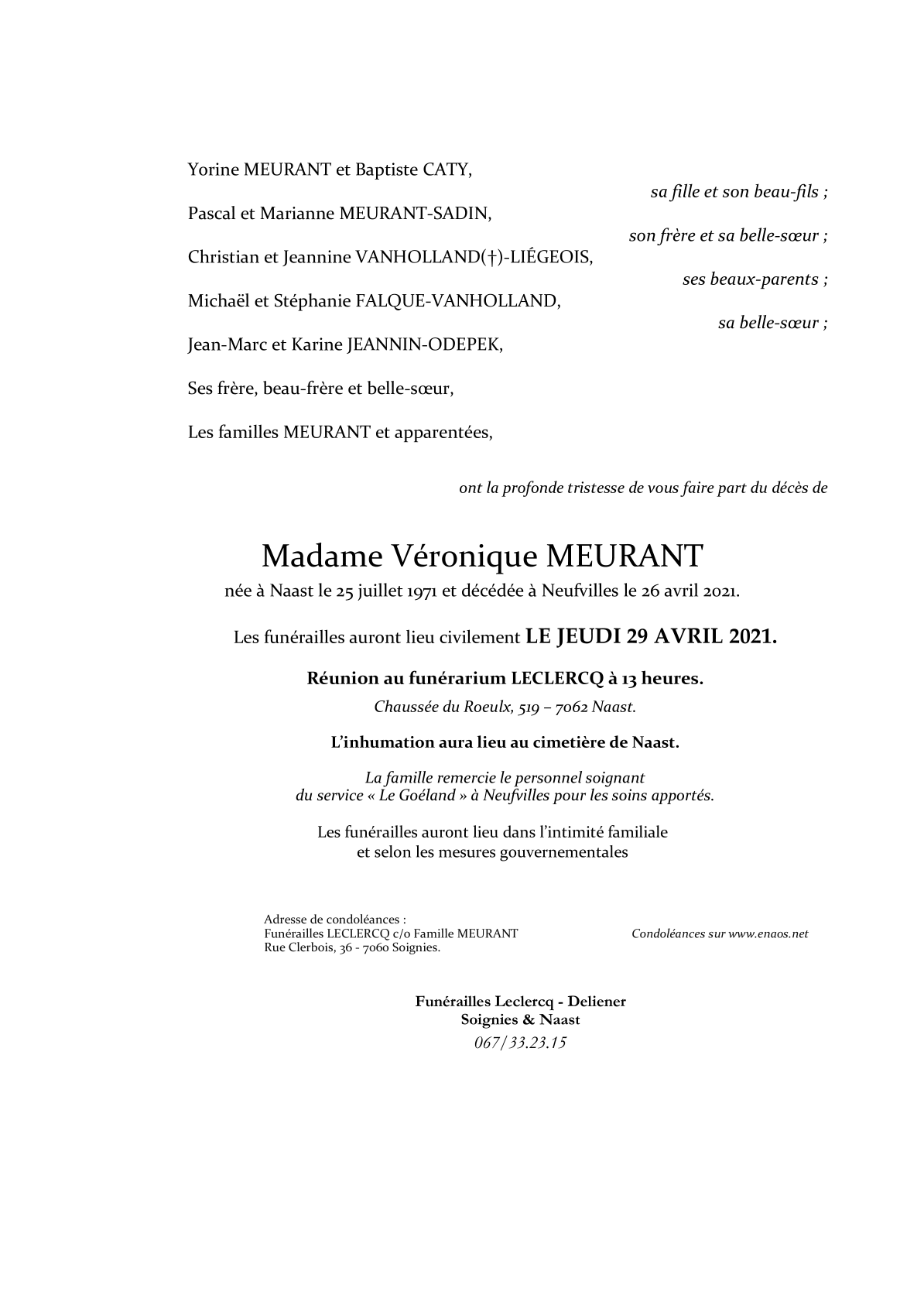 Décédée à Neufvilles (7063, Belgique) le lundi 26 avril 2021 à l'âge de 49 ans