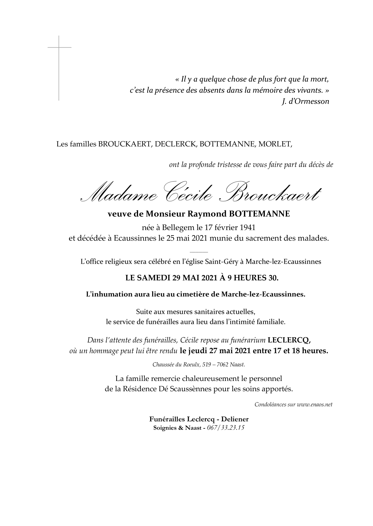 Décédée à Ecaussinnes (7190, Belgique) le mardi 25 mai 2021 à l'âge de 80 ans