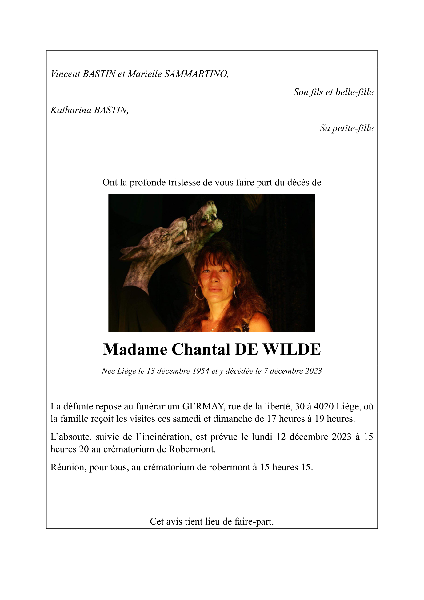 Décédée à Liège (4000, Belgique) le jeudi 7 décembre 2023 à l'âge de 68 ans