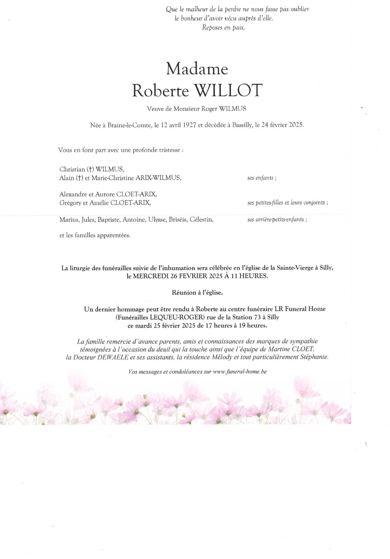 Décédée à Bassilly (7830, Belgique) le lundi 24 février 2025 à l'âge de 97 ans