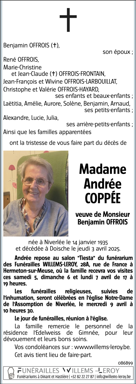 Décédée à Doische (5680, Belgique) le jeudi 3 avril 2025 à l'âge de 90 ans
