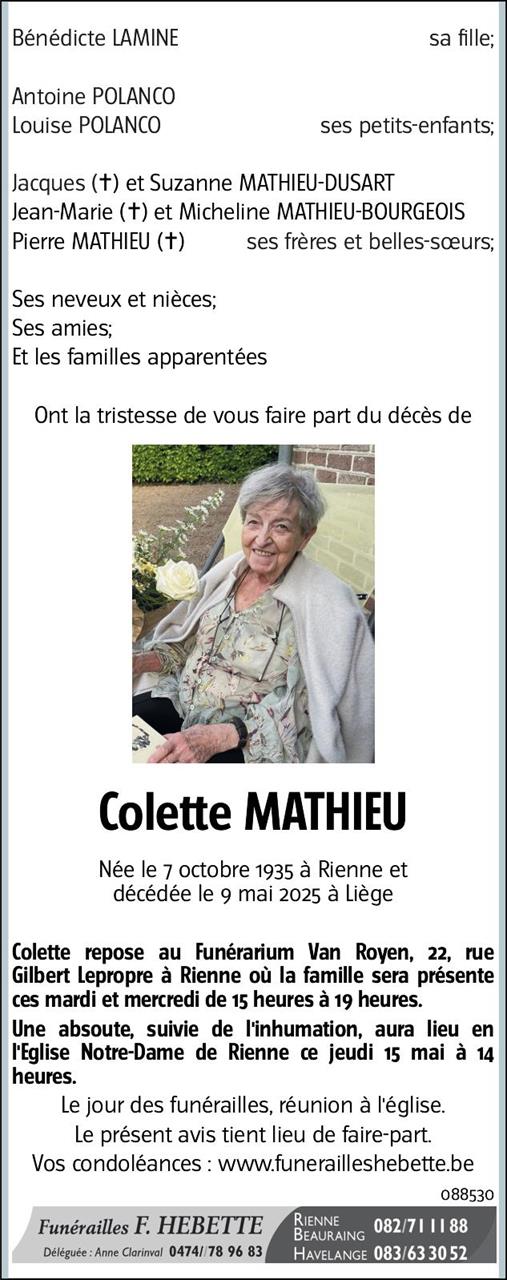 Née à Rienne (5575, Belgique) le lundi 7 octobre 1935