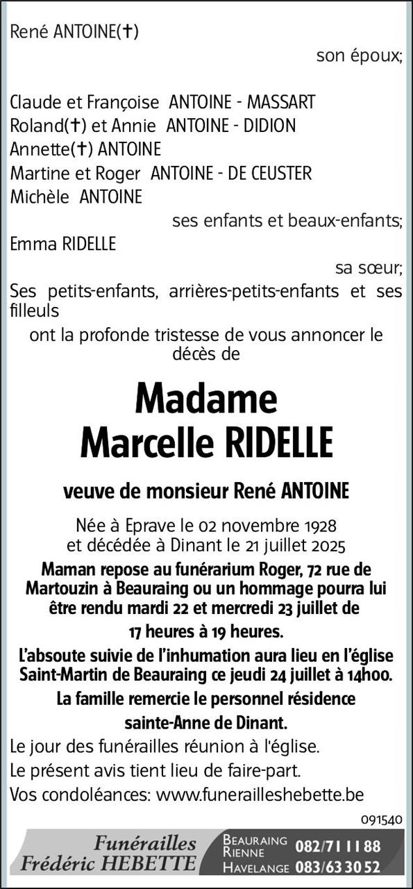 Décédée à Dinant (5500, Belgique) le lundi 21 juillet 2025 à l'âge de 96 ans