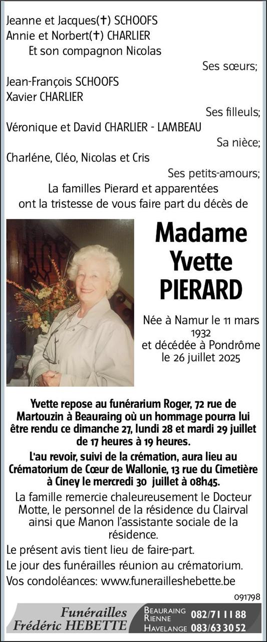 Décédée à Pondrôme (5574, Belgique) le samedi 26 juillet 2025 à l'âge de 93 ans