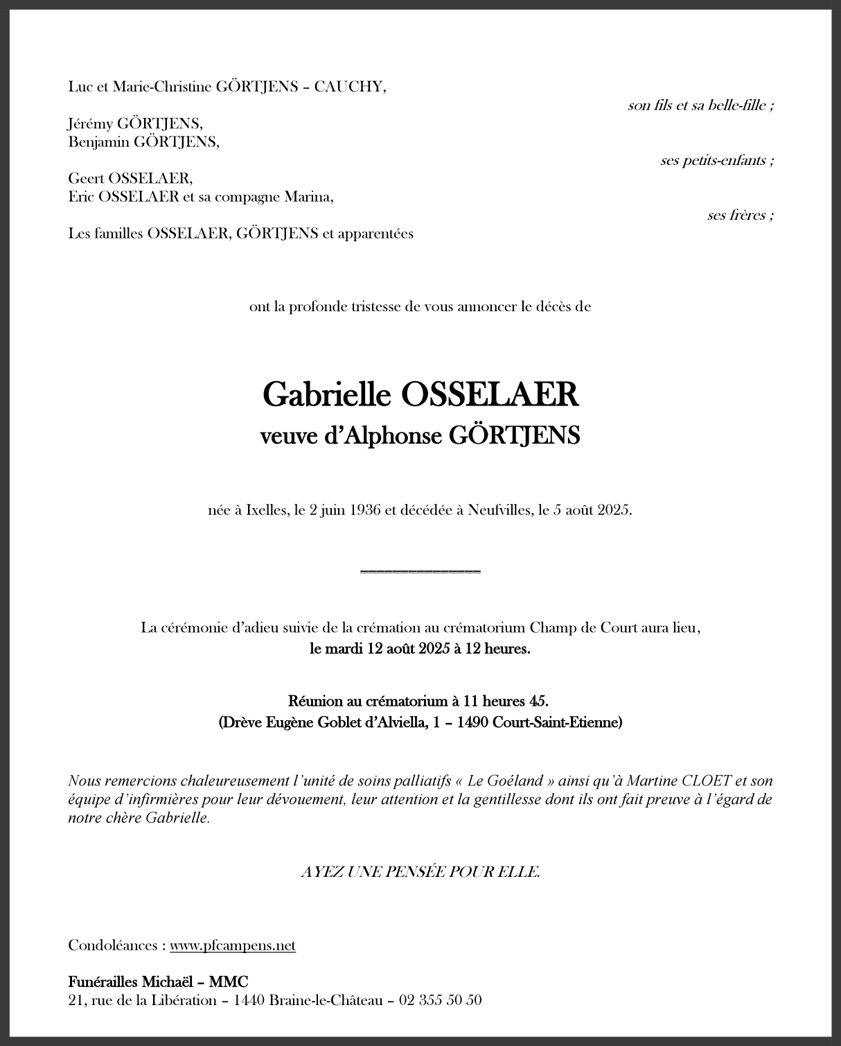 Viuda de Monsieur Alphonse GÖRTJENS