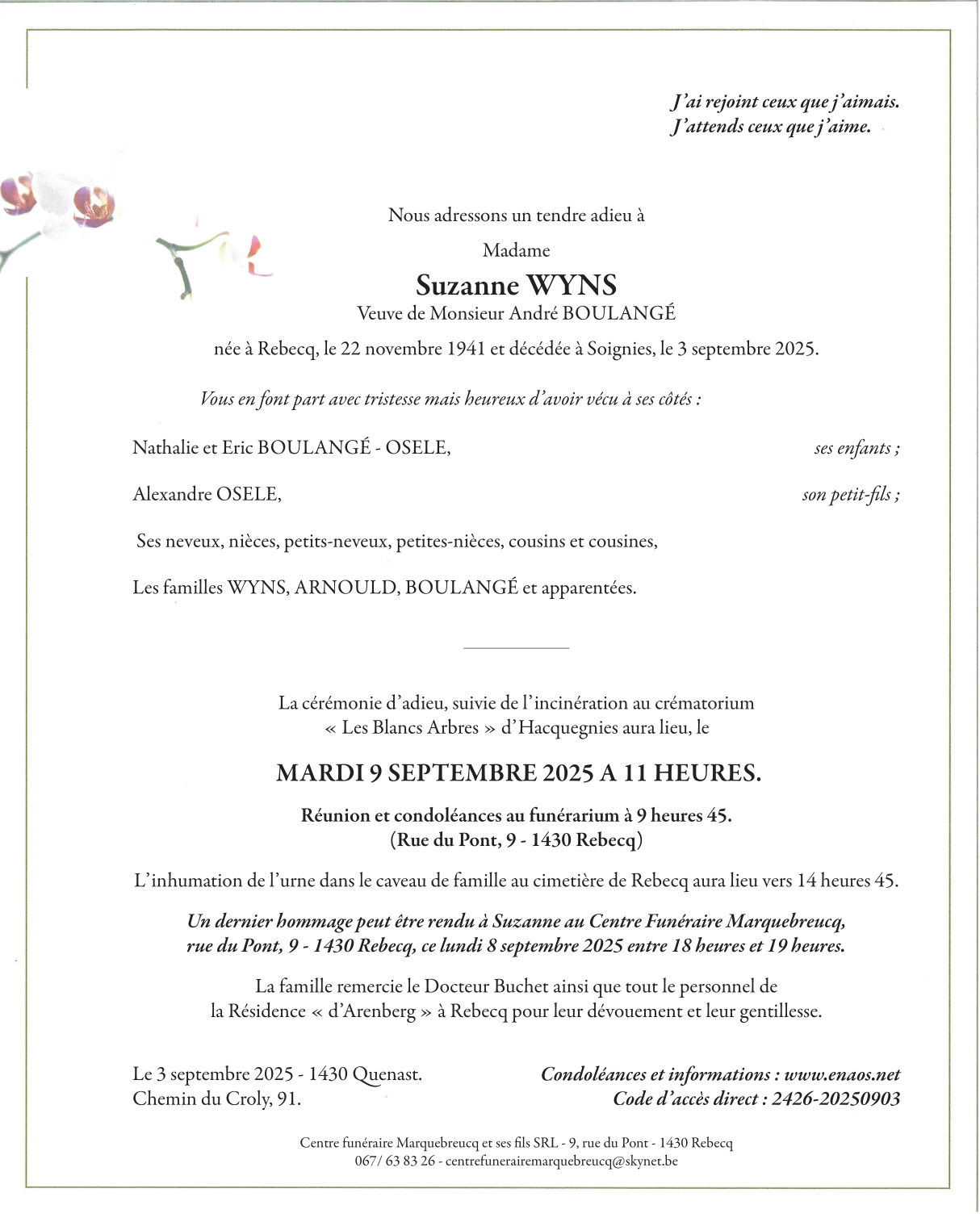 Veuve de Monsieur André BOULANGÉ