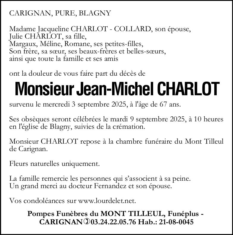 Décédé à Carignan (08110, France) le mercredi 3 septembre 2025 à l'âge de 67 ans