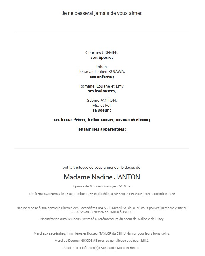 Décédée à Mesnil-Saint-Blaise (5560, Belgique) le jeudi 4 septembre 2025 à l'âge de 68 ans