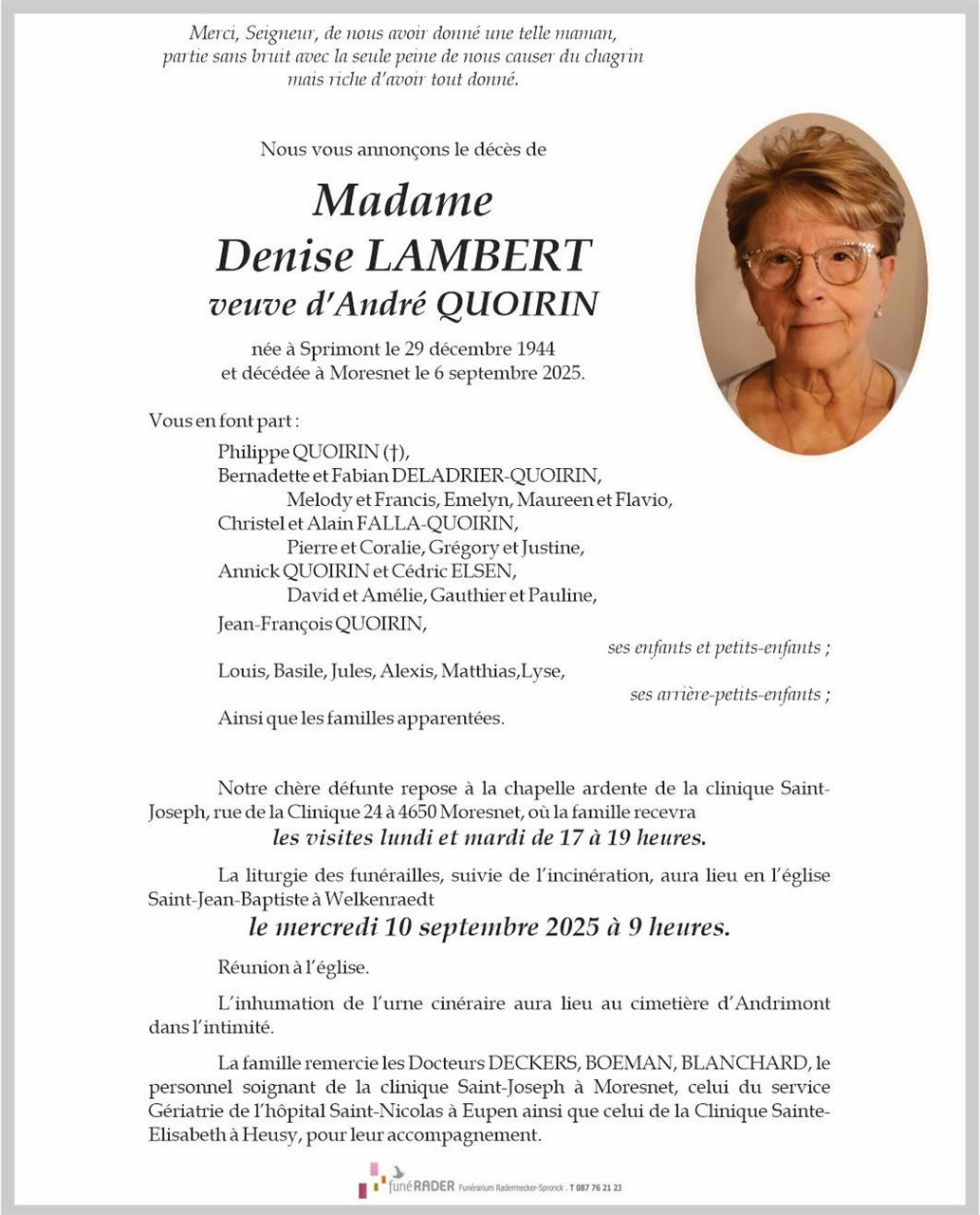 Décédée à Moresnet (4850, Belgique) le samedi 6 septembre 2025 à l'âge de 80 ans